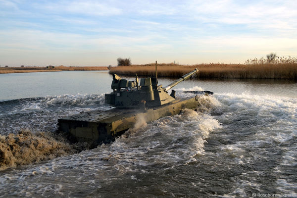 Авиадесантируемый плавающий танк «Спрут» оснащен 125-мм гладкоствольной пушкой и пулеметами. По огневой мощи эта гусеничная машина сопоставима с основными танками РФ. Максимальная скорость «Спрута» по шоссе составляет 70 километров в час.