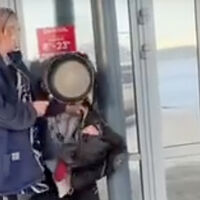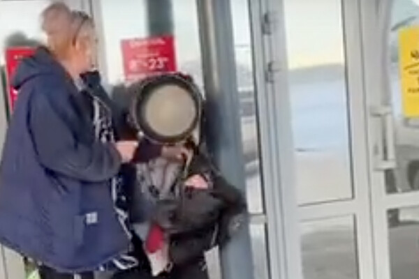 На них продавец прижала мужчину, внешне похожего на бродягу, к стене магазина на улице и лупит его сковородой по голове. При этом сотрудница супермаркета нецензурно выражается в адрес оппонента.