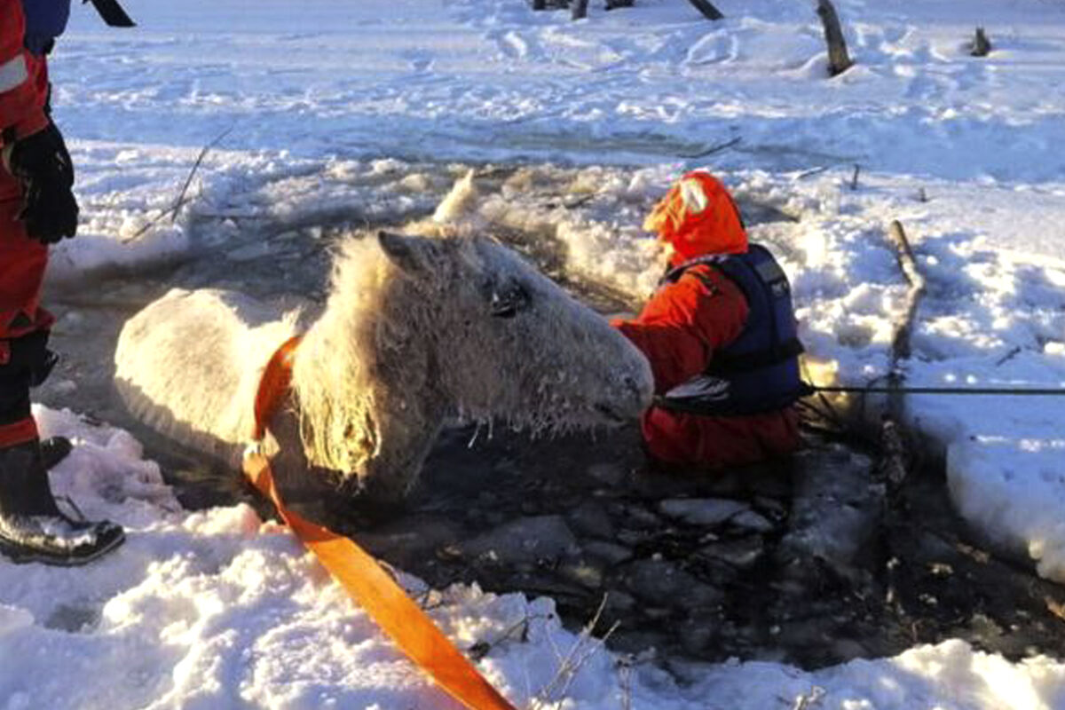Прибывшие на место спасатели при помощи бензопилы пропилили лед и освободили животному дорогу к суше. Усилиями десяти человек лошадь на носилках вынесли из воды — она окоченела и не могла передвигаться самостоятельно. Ей оказали первую помощь и помогли встать на ноги.