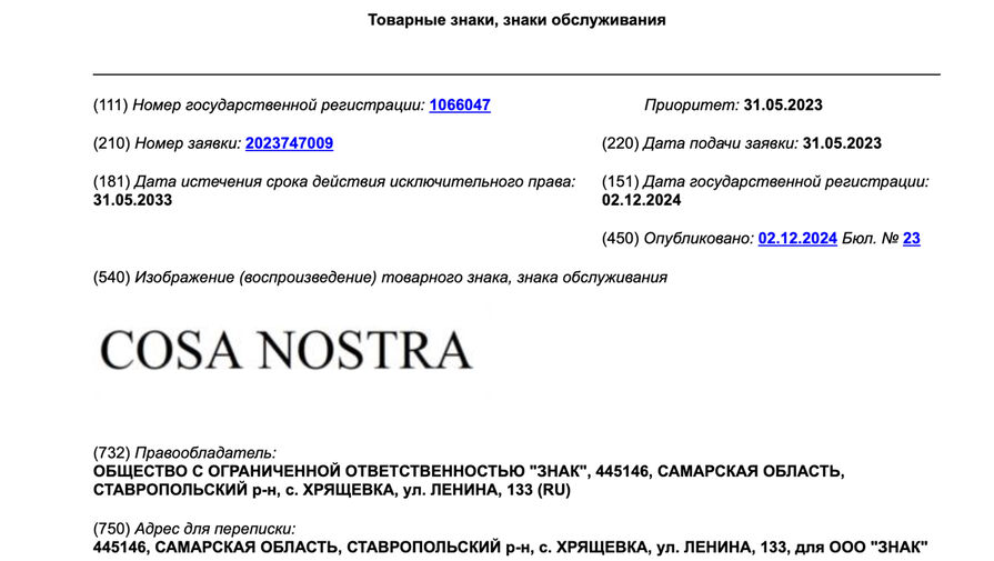 В России официально зарегистрировали товарный знак Cosa Nostra. Документ публикуется на сайте Федерального института промышленной собственности.