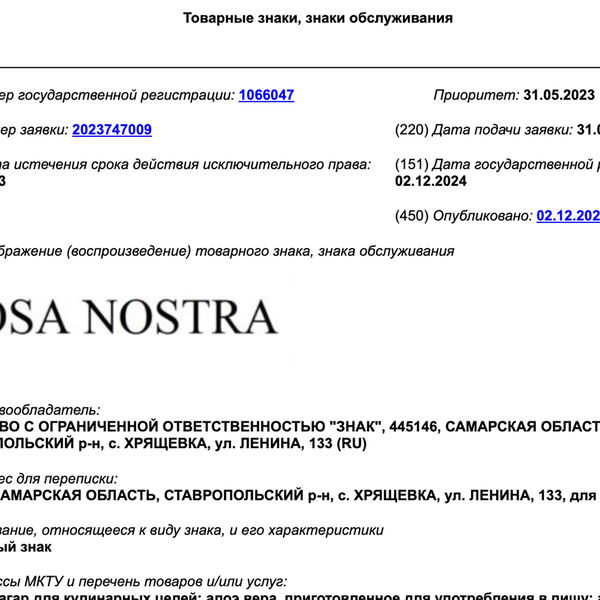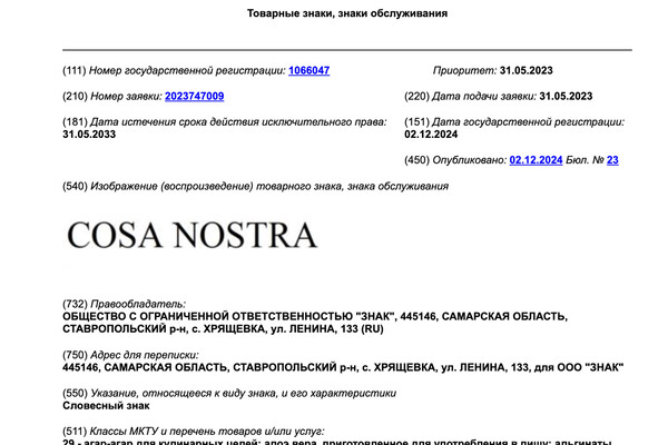 В России официально зарегистрировали товарный знак Cosa Nostra. Документ публикуется на сайте Федерального института промышленной собственности.