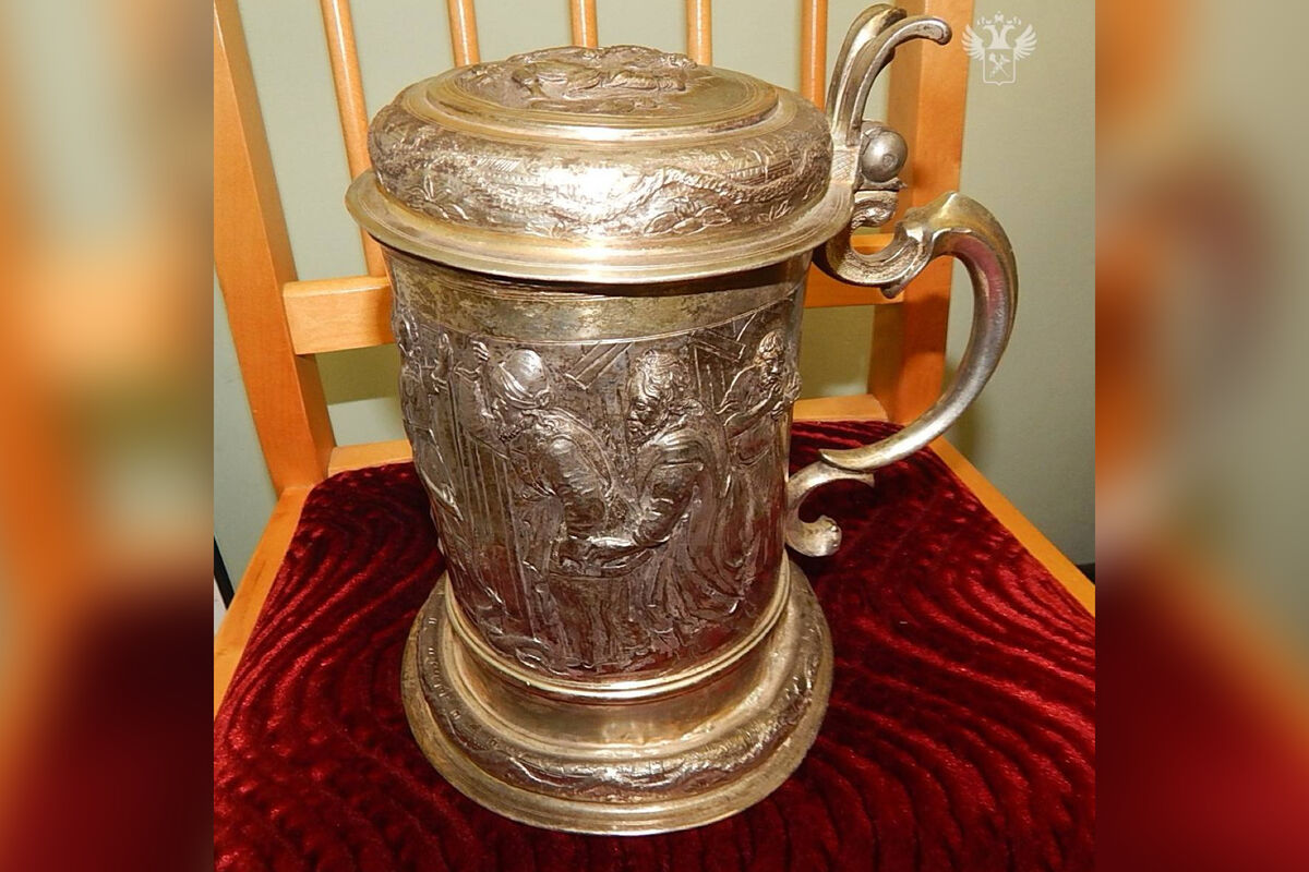 «На кружке на изображена библейская сцена из Нового Завета. Крышка украшена мотивами из Евангелия от Луки «Притча о блудном сыне» и растительным орнаментом. Это произведение искусства представляет коллекционный интерес и относится к культурным ценностям», — уточнили в пресс-службе ведомства, добавив, что эксперты оценили предмет в 374 тысячи рублей.