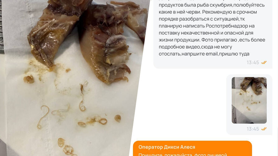 «1 апреля я сделала заказ в приложении «Дикси-доставка». Среди продуктов была «Скумбрия Главрыба» холодного копчения, в которой были обнаружены паразиты «анизакиды». Рыба была упакована в вакуум по кусочкам. Так как упаковка занимает много места, я вскрыла ее и переложила рыбу в чистый стеклянный контейнер, а упаковку выбросила в мусор. Когда стала есть на следующий день, решила вскрыть брюшко кусочка снизу, чтобы проверить, нет ли там паразитов — с рыбой всегда так делаю. Как оказалось, они там были, и не один, а во множественном количестве», — сказала Елена.