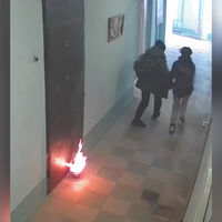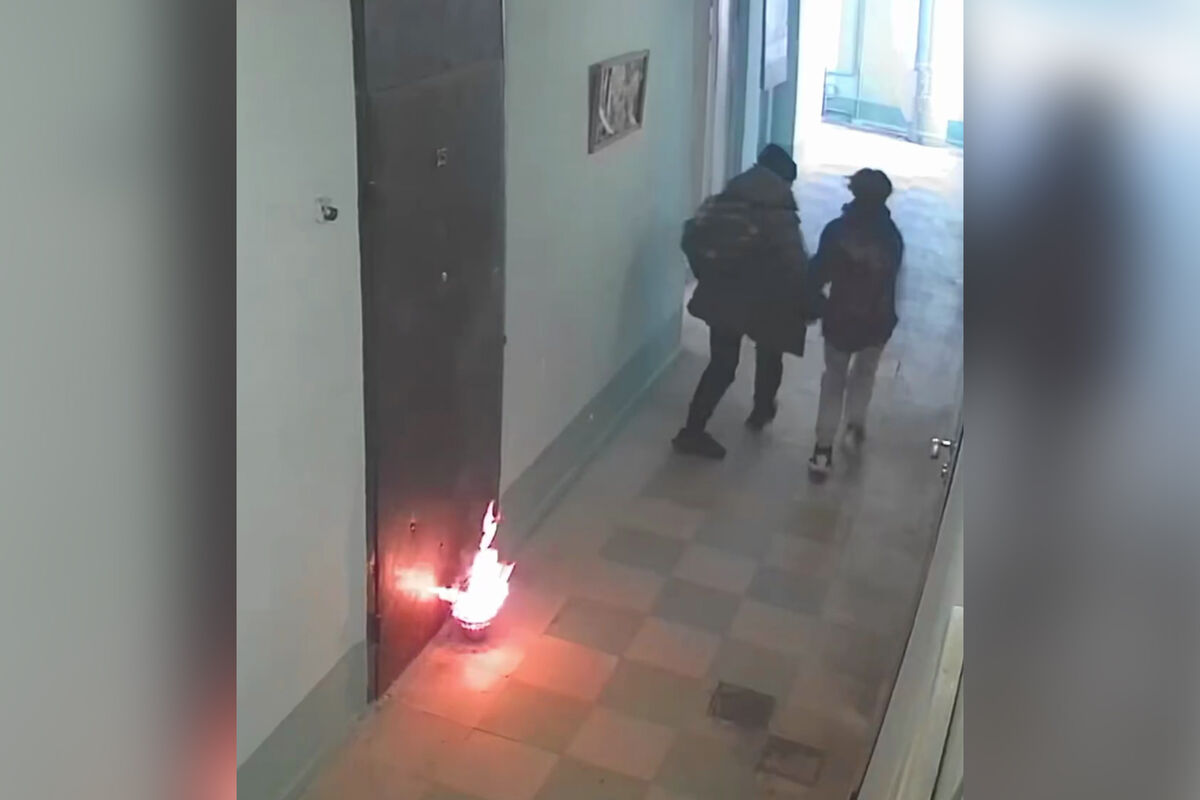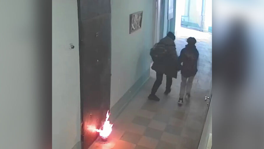 Инцидент произошел в подмосковном Протвино. Судя по кадрам, юноша и девушка, предположительно школьники, пытались устроить в подъезде пожар. Они пришли к одной из квартир, поставили под дверью предмет, похожий на вазу с бумагой, и подожгли его. Дождавшись, когда огонь охватит весь предмет и перекинется на входную дверь, хулиганы скрылись.