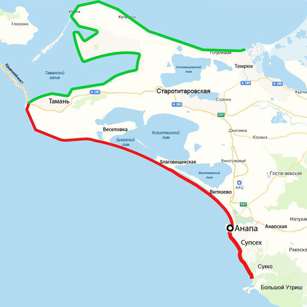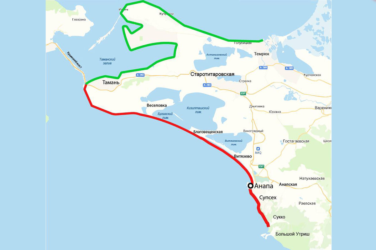 Оперативный штаб Краснодарского края в своем Telegram-канале опубликовал карту прибрежных территорий, где ближайшие закрытые для купания пляжи вблизи Анапы помечены красной линией, а открытые — зеленой.