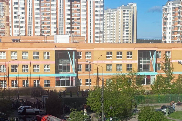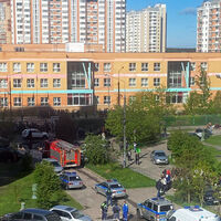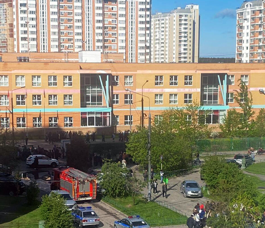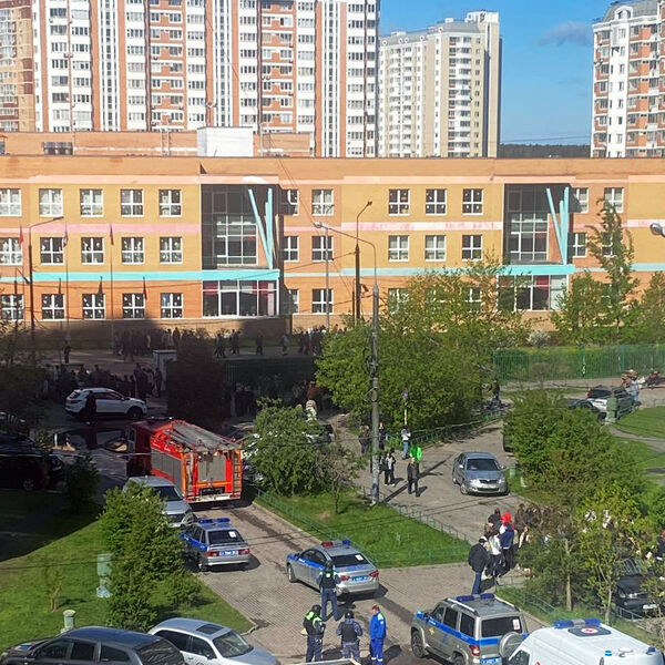 На кадрах видно, что школьников вывели с территории учебного заведения, рядом дежурят экипажи скорой помощи, сотрудники полиции и пожарные расчеты.