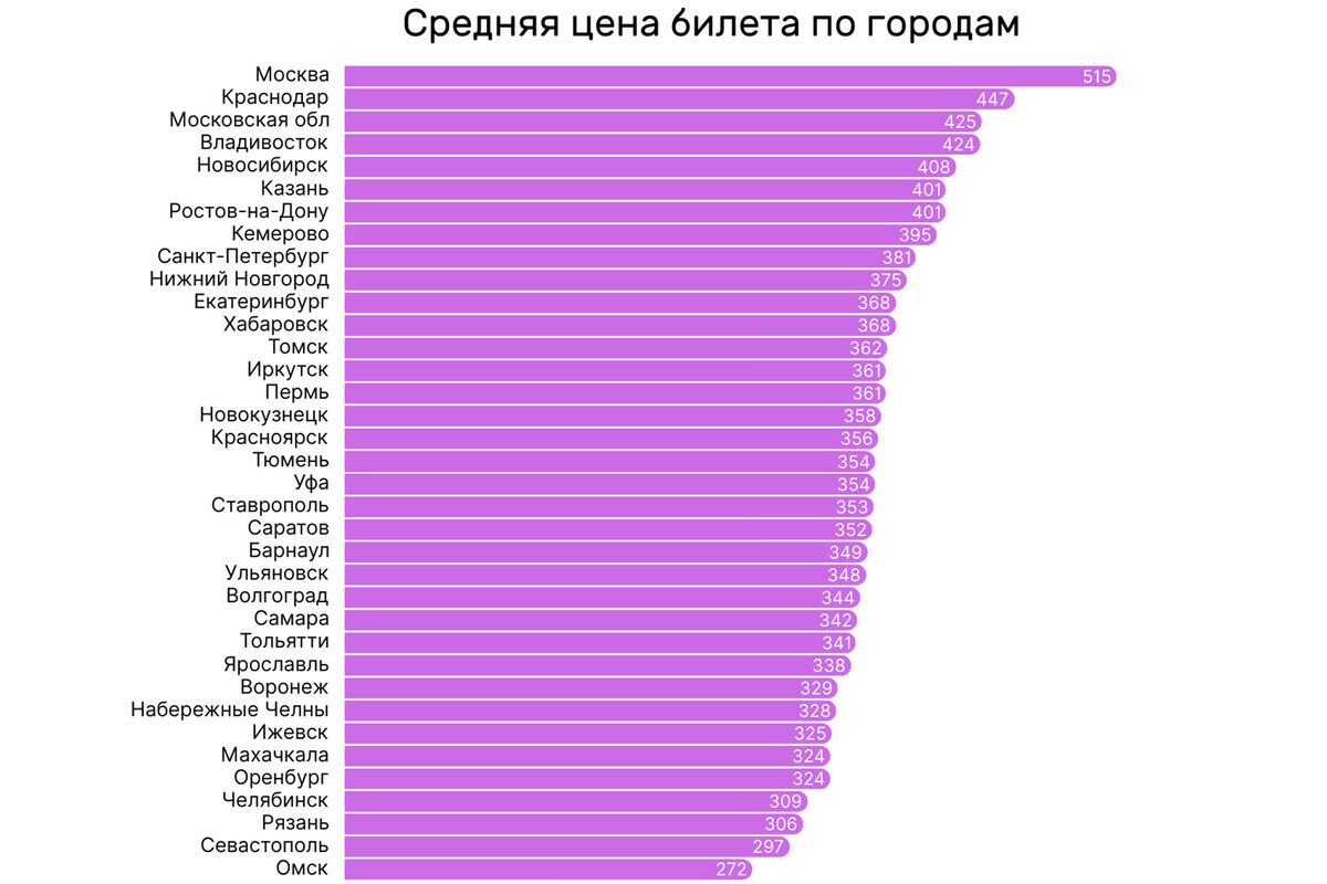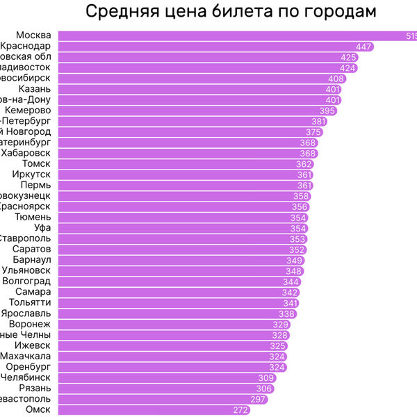 Исследовательский центр коммуникационной группы PROGRESS проанализировал стоимость билетов в кинотеатры по городам России и выявил значительные различия в цене между регионами. Согласно данным исследования, разница в средней цене билета достигает почти двух раз — от 272 до 515 рублей.