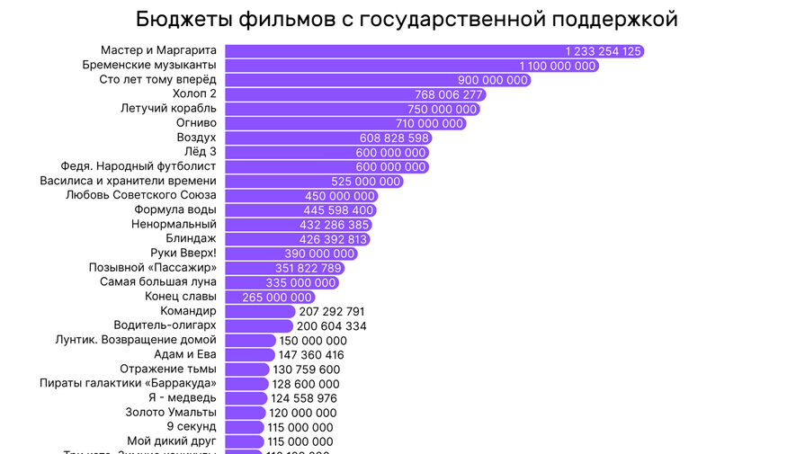 Первое место по объему государственной поддержки занял фильм с общим бюджетом в один миллиард рублей «Бременские музыканты», получивший 700 миллионов рублей господдержки. Следом за ним в списке — фантастическая лента «Сто лет тому вперед», получившая 615 млн рублей от государства (общий бюджет фильма — 900 млн рублей), и масштабная экранизация «Мастер и Маргарита» с общим бюджетом фильма около 1 млрд рублей, из которых 600 млн руб. составило государственное финансирование. Все три проекта сопровождались активными рекламными кампаниями и ставкой на массовую аудиторию.