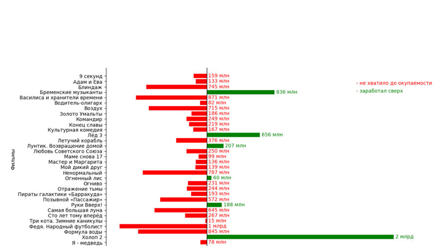 На другом полюсе оказалась картина «Федя. Народный футболист» — крупнейший провал года. Фильм не добрал до окупаемости более миллиарда рублей, став антирекордсменом по возврату вложений — доля государственного финансирования картины составила 125 млн рублей.
