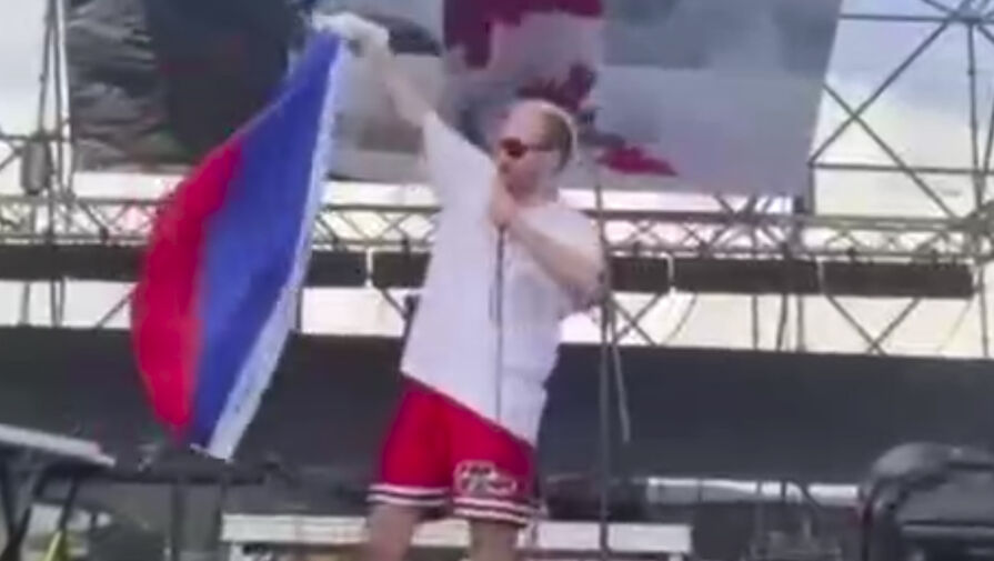 На видеозаписи, которую опубликовали зрители, музыкант сначала бросил флаг на пол, после чего положил его в пакет и сымитировал мочеиспускание на него.