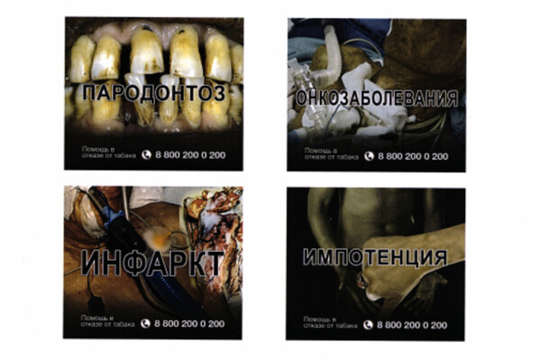 В приложении представлены эскизы предупреждений о вреде потребления табачных изделий, которые могут привести к развитию онкологических заболеваний, инфарктов, импотенции и пародонтоза. Также на них указан номер телефона консультативного центра помощи в отказе от табака.