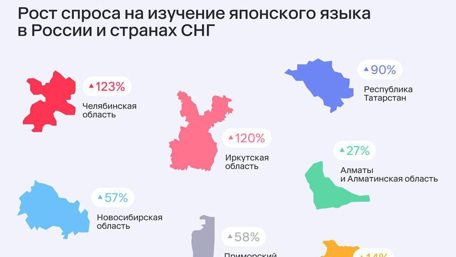 Максимальный рост спроса на услуги репетиторов по японскому языку был зафиксирован в Челябинской и Иркутской областях. Жители областей стали более чем в 2 раза чаще интересоваться изучением японского языка. За год наблюдался рост на 123% в Челябинской области и на 120% в Иркутской области.