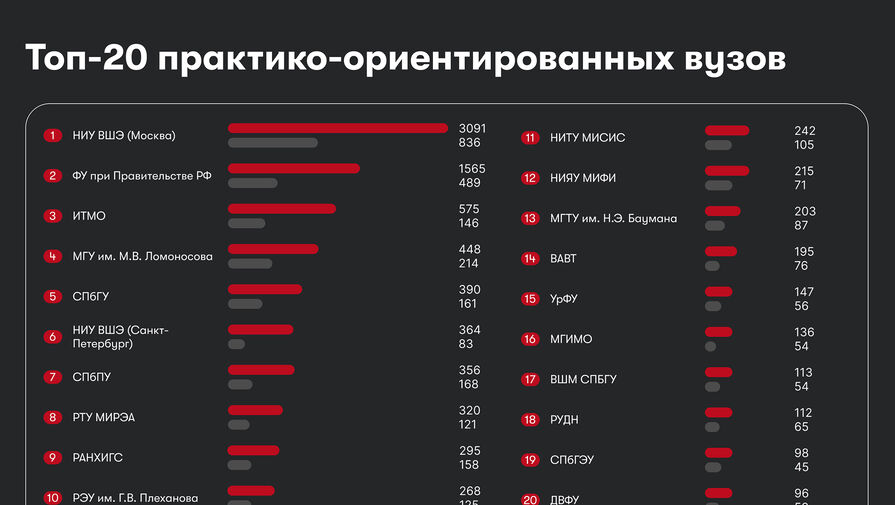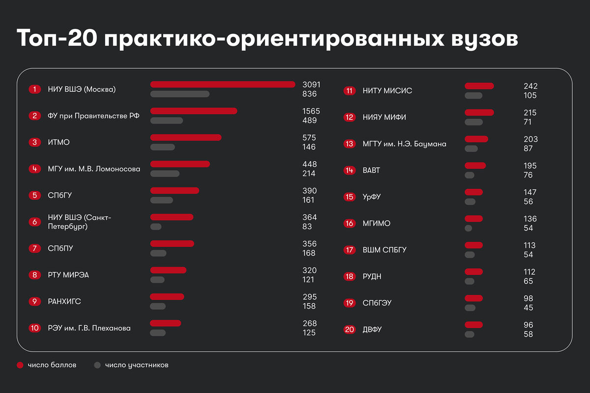 Второе место в рейтинге занял Финансовый университет при правительстве РФ: вуз в чемпионатах представили 489 студентов, шесть из них заняли призовые места. Замкнул тройку лидеров Университет ИТМО — несмотря на относительно небольшое число участников (146 студентов), он показал самый высокий процент победителей: каждый пятый студент оказался в числе сильнейших. На четвертом и пятом месте топа расположились МГУ (204 студента, 6 финалистов) и СПбГУ (161 студент, 4 финалиста) соответственно.