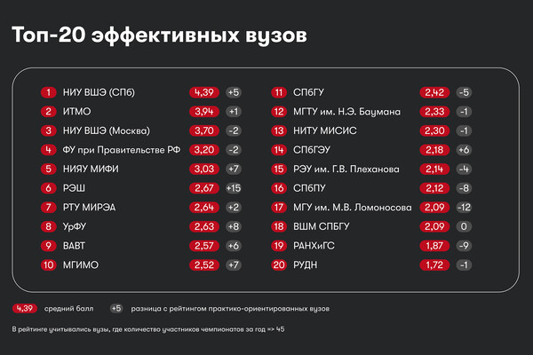 Внимание исследователи уделили не только количественным показателям, но и эффективности подготовки — то есть соотношению полученных баллов к числу участников. Этот рейтинг возглавил уже петербургский кампус ВШЭ. Из 83 участников семь студентов вышли в финал, а четверо стали победителями. Высокую эффективность также показали ИТМО и московская Вышка. А замыкают топ-5 Финансовый университет и МИФИ (71 студент, три призера и один победитель). Таким образом, лидеры общего рейтинга подтверждают не только активность и вовлеченность студентов, но и качество их подготовки.