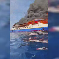 На видео попал охваченный пламенем паром, с которого в небо поднимаются густые клубы черного дыма. Пассажиры в оранжевых спасательных жилетах прыгают с борта судна прямо в воду.