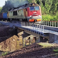 Обрушение железнодорожного моста на 48-м км трассы Тросна — Калиновка в Курской области произошло в ночь на 1 июня. В тот момент по переправе двигался грузовой локомотив. Одна из секций состава рухнула на расположенную под мостом автомобильную дорогу. После падения началось возгорание тепловоза, но огнеборцам удалось оперативно ликвидировать пожар.