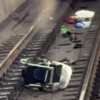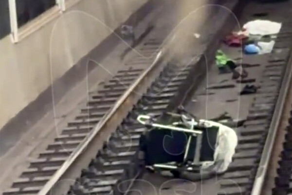 В какой-то момент она двигается с места, и пассажирки обращают на нее внимание, только когда она уже находится за желтой линией. Не проходит и минуты, как по этим рельсам проезжает поезд. При этом ребенок находится в руках одной из женщин. Вскоре коляску с путей убрали.