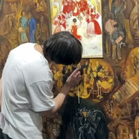 Кадры с места реставрации картины опубликовал Telegram-канал «E1.RU». На видео можно заметить, что специалист с помощью специального инструмента устраняет поврежденный слой, возвращая полотну прежний вид.