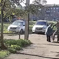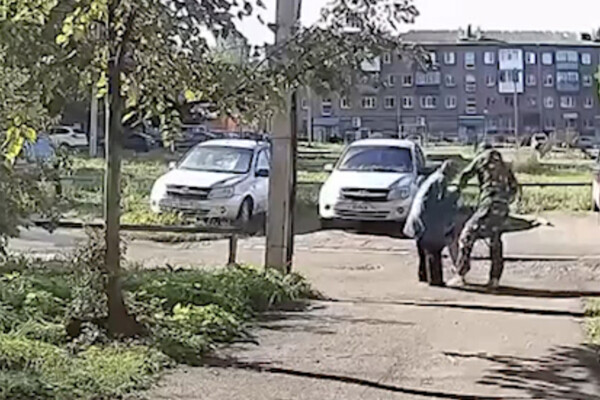 Все произошло во дворе дома на Социалистической улице. Судя по кадрам, мужчина в камуфляже заговорил с пожилой женщиной и стал возмущаться тому, что ее собака находится в общественном месте без намордника.