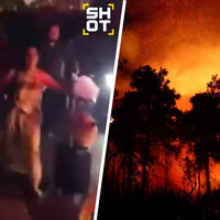 На видеозаписи видно, как несколько человек с чемоданами и сумками идут по тротуару. Судя по видеозаписи, огонь подошел совсем близко к отелю — огромный столб дыма и зарево проглядываются из-за каменного забора на противоположной стороне дороги.