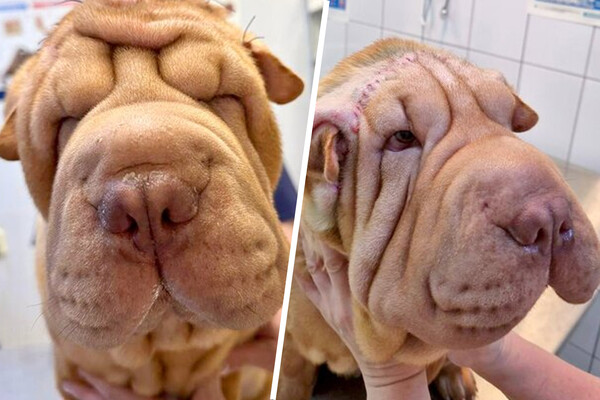 «Сначала складки пробовали зафиксировать временными швами в надежде на то, что с возрастом у щенка они придут в норму, но результата это не дало. «Поднять веки» удалось только после радикальной пластической операции: хирург подтянула кожу и убрала фрагмент размером около 30 на 15 см, чтобы глаза открылись», — добавили в госветслужбе.