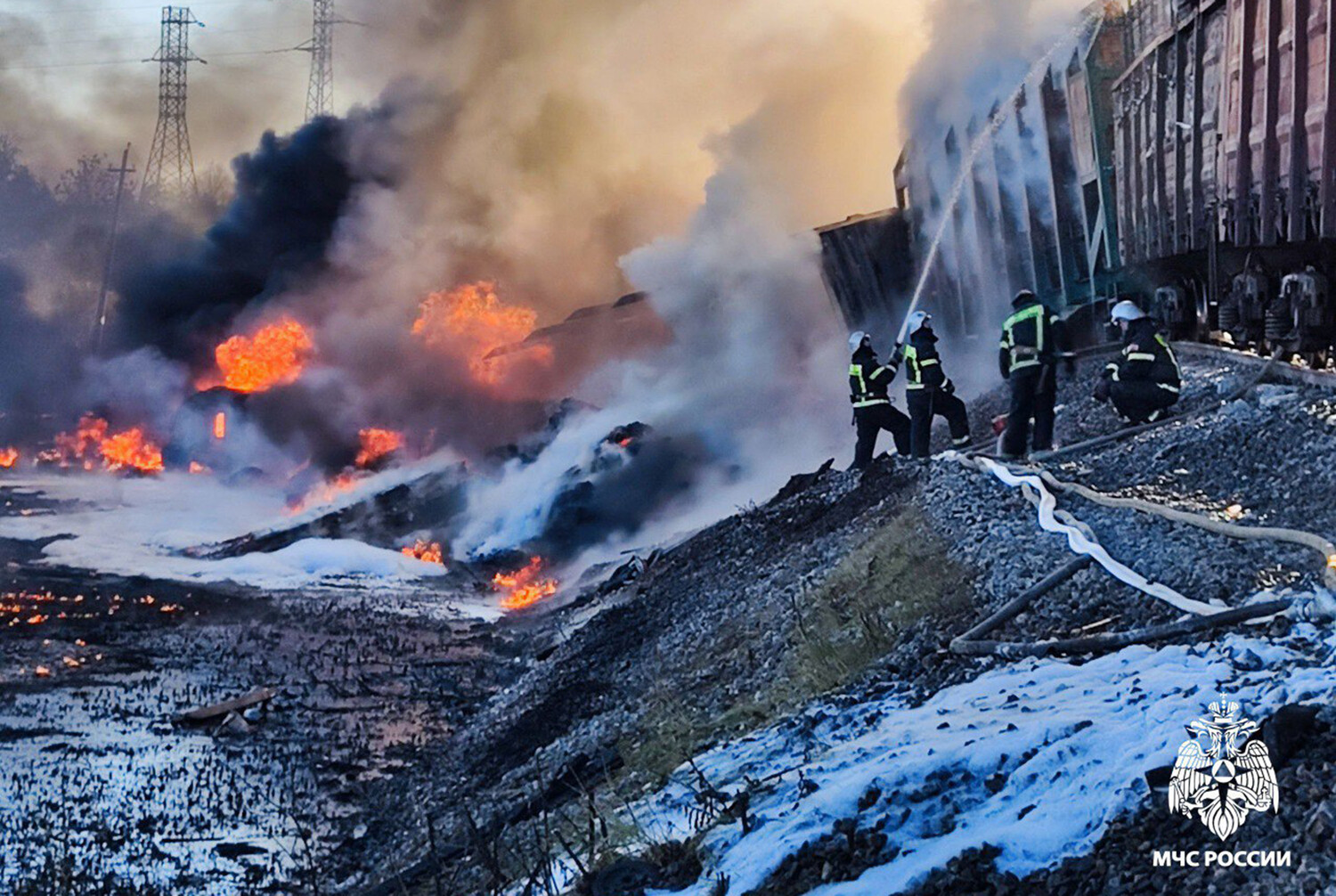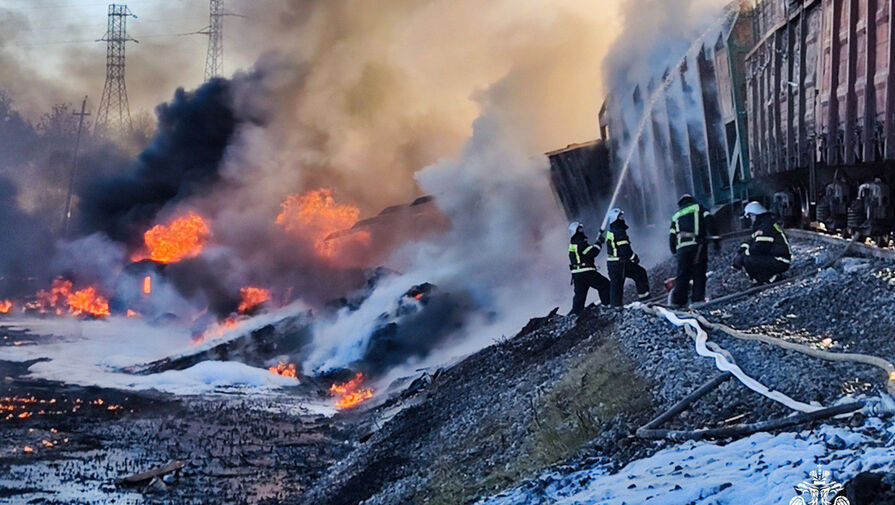 Позднее в МЧС РФ уточнили, что огонь охватил шесть цистерн с ГСМ. Также ведомство опубликовало видео с места происшествия. На кадрах видно, как сотрудники экстренных служб борются с пламенем.