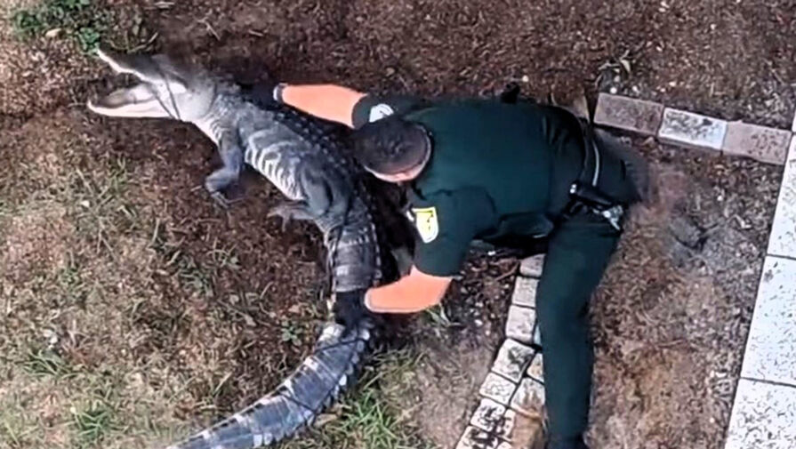 В американском штате Флорида полицейскому пришлось вступить в борьбу с крупным аллигатором, проникшим на территорию частного домовладения. Видеозапись инцидента опубликовало издание What's The Jam.