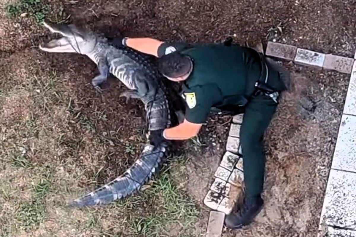 Жительница округа Лейк обнаружила хищную рептилию в своем саду. Прибывшие на место вызова сотрудники полиции, вооружившись веревками, приступили к поиску аллигатора. Вскоре один из полицейских обнаружил животное и атаковал его.