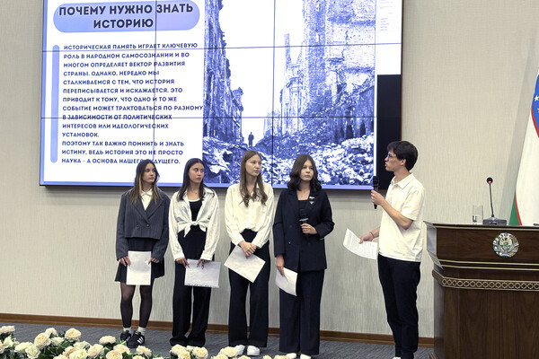 Презентацию провели на территории мемориального комплекса «Парк Победы». В рамках мероприятия школьники средних и старших классов Ташкента представили доклады, направленные на разоблачение попыток западных стран переписать историю и присвоить себе победу во Второй мировой войне.