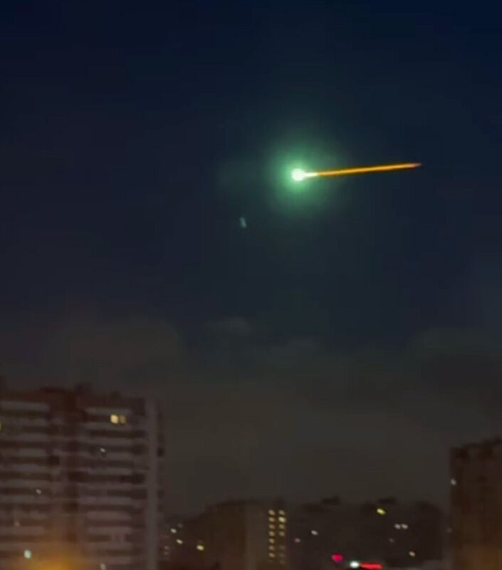 Очевидцы зафиксировали неопознанный летающий объект в небе над Москвой и Подмосковьем примерно в 6:30 мск утром в понедельник. На опубликованных видео объект оставляет за собой яркий зеленоватый след и пролетаeт над жилыми домами, предположительно в районе Рублевского шоссе.