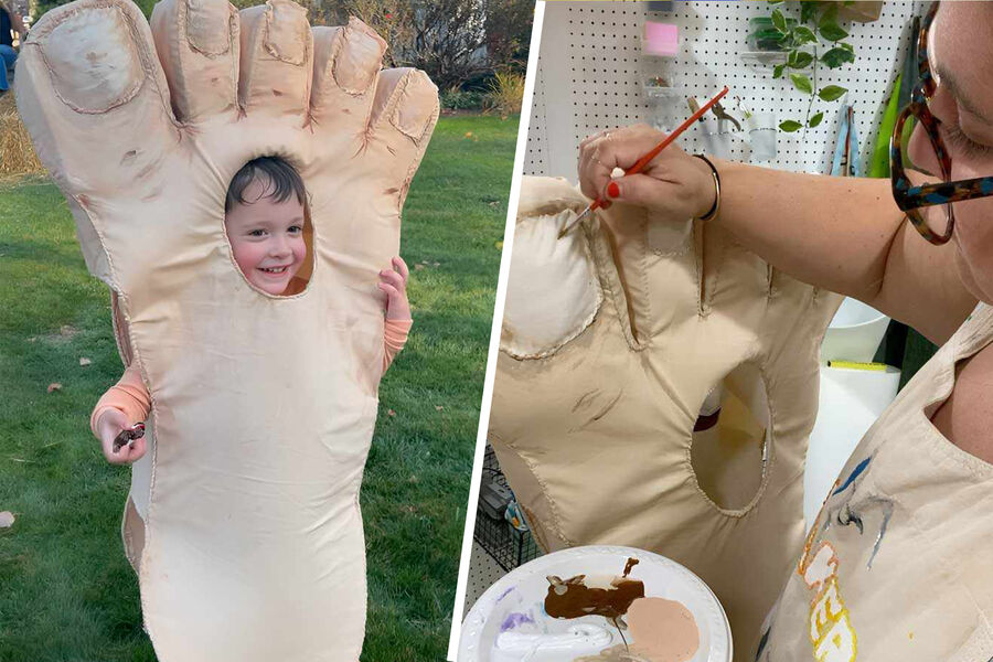 Кристин, которая управляет арт-студией, сама сшила наряд. Она вырезала форму ступни из плотного пеноматериала, покрыла тканью и вручную прошила все швы, специально сделав их «кривыми», чтобы костюм выглядел реалистично. Завершающим штрихом стали «отвратительные длинные ногти» и нарисованные следы грязи и вони.