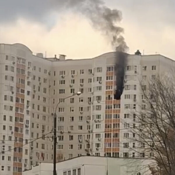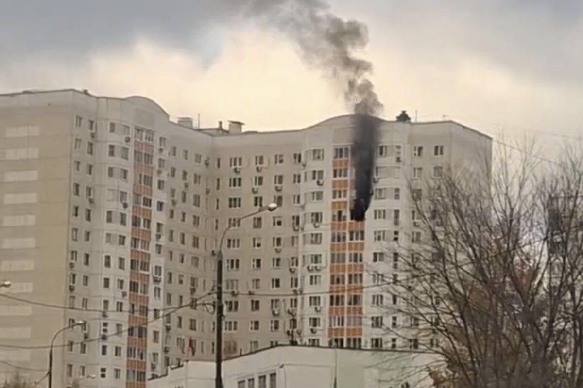 На видео с места происшествия из окна многоэтажки поднимается столб черного дыма.