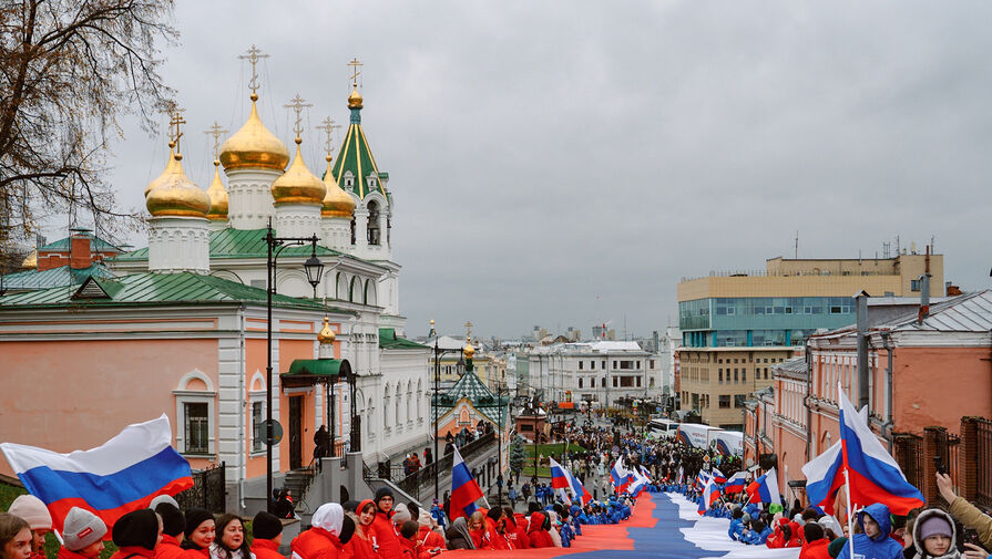 Жители Нижнего Новгорода развернули 100-метровый флаг России на Ивановском съезде у Кремля по случаю Дня народного единства. Об этом сообщает ТАСС.