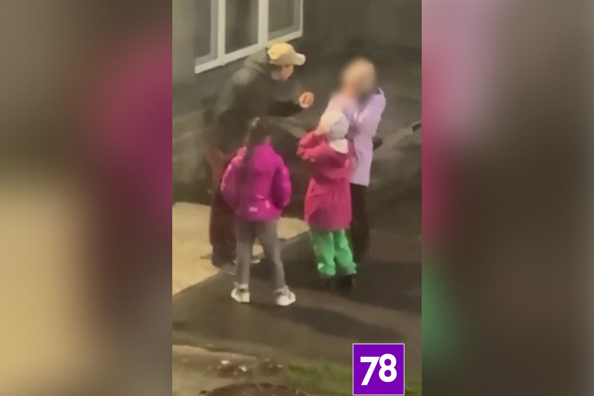 На кадрах, опубликованных изданием, видно, как мужчина в кепке бьет по лицу двух из трех девочек, которые стоят рядом с ним на улице.