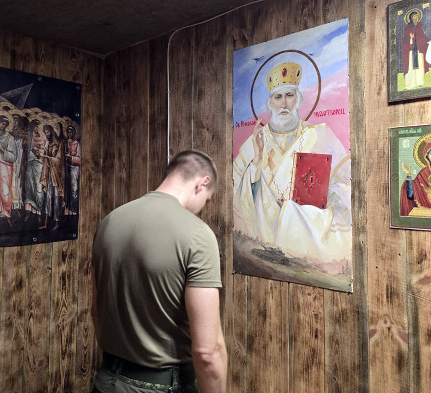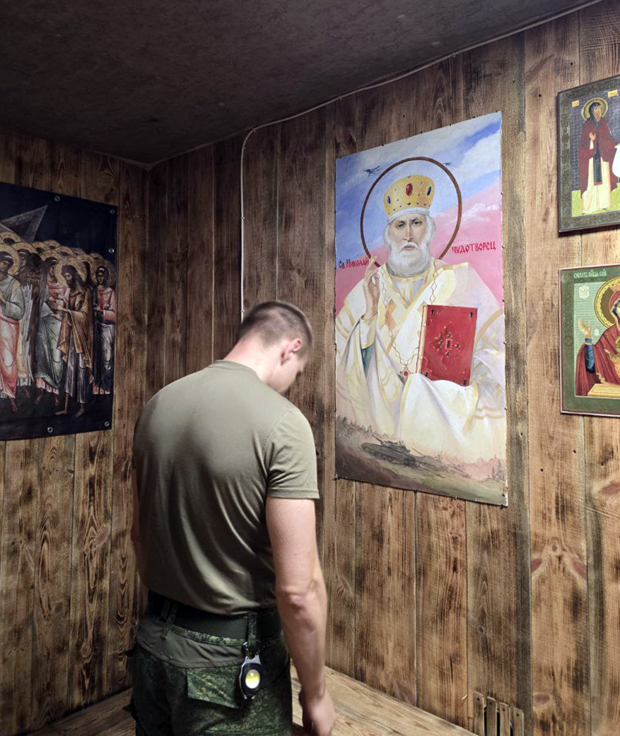 На фотографии запечатлен мужчина, молящийся перед этой иконой в форме российского военнослужащего. Икона представляет собой современную интерпретацию классического изображения Николая Чудотворца — святой держит Евангелие в одной руке, а пальцами другой руки совершает жест благословения. Фон иконы разделен на несколько частей: в небе пролетают самолеты, ниже — движутся танки на земле, а из облаков в белых, синих и красных оттенках складывается российский триколор.