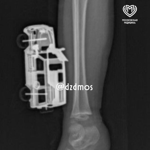 По словам родителей, ребенок прыгнул с кровати у себя дома и неудачно упал на игрушку правой голенью. Машинка повредила мягкие ткани, ее части вошли глубоко и достигли подкожножировой клетчатки.
