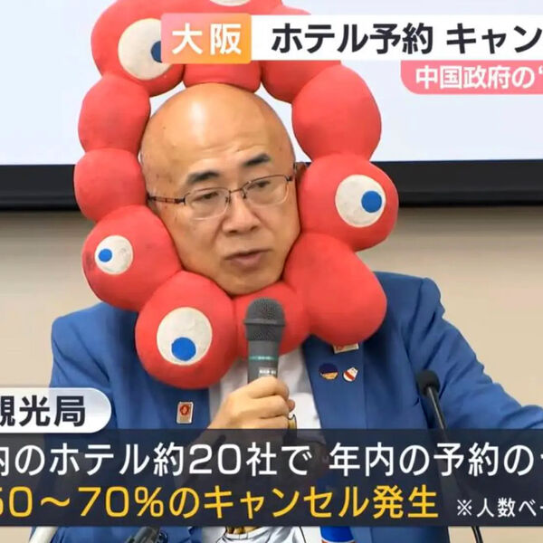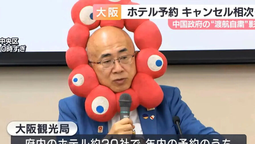 На пресс-конференции, посвященной влиянию политики на туризм, президент Бюро конгрессов и туризма Осаки Хироси Мидзёхата представлял тревожную статистику. Однако внимание аудитории приковывал к себе не только его доклад, но и ярко-красный плюшевый головной убор, обрамлявший его лицо и напоминающий корону с глазами.