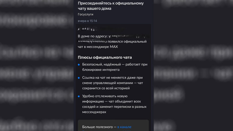 Россияне начали получать от Госуслуг уведомления о создании домовых чатов в мессенджере MAX. В этом убедился корреспондент «Газеты.Ru».