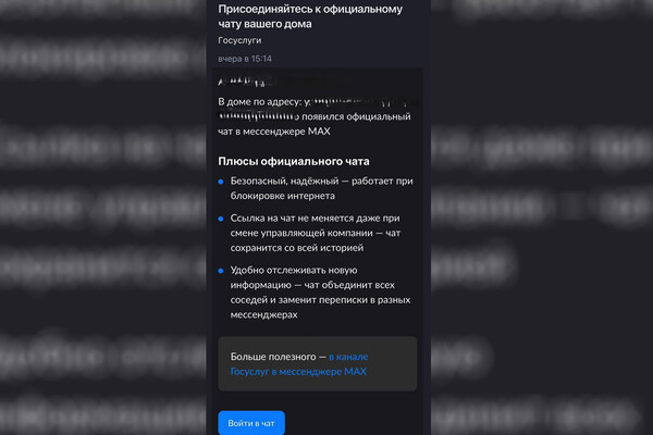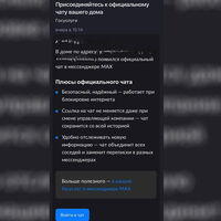 В уведомлениях подчеркивается, что такие чаты — безопасные и стабильные, а также работают даже при блокировке интернета. В плюсах указали, что ссылка на них не меняется при смене управляющей компании. Пользователям указывают, что единый домовой чат должен заменить разрозненные переписки в других сервисах и упростить получение обновлений о жизни дома.