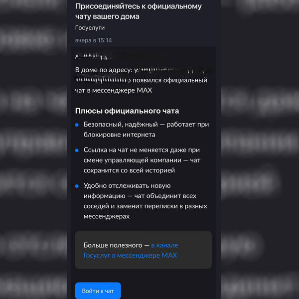 В уведомлениях подчеркивается, что такие чаты — безопасные и стабильные, а также работают даже при блокировке интернета. В плюсах указали, что ссылка на них не меняется при смене управляющей компании. Пользователям указывают, что единый домовой чат должен заменить разрозненные переписки в других сервисах и упростить получение обновлений о жизни дома.
