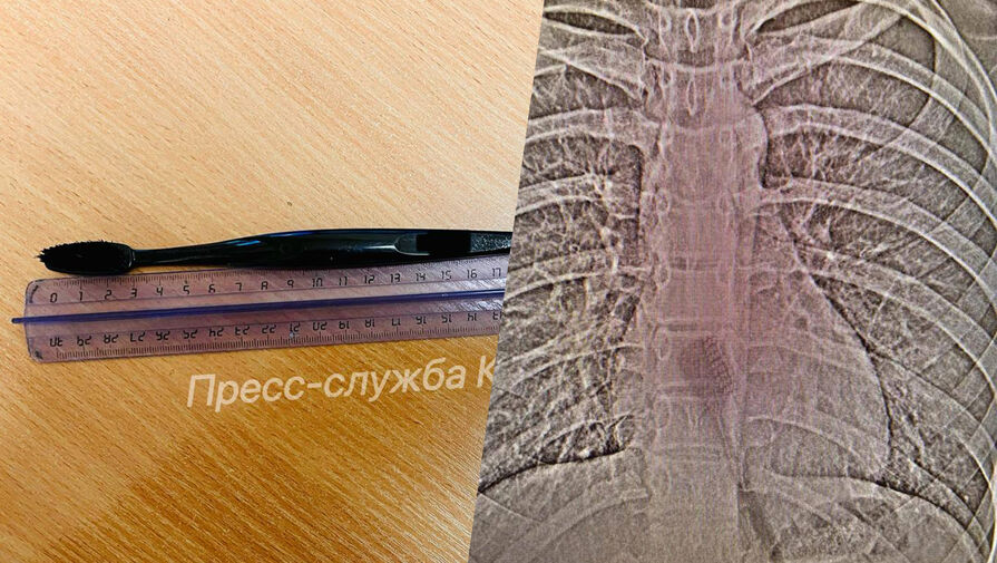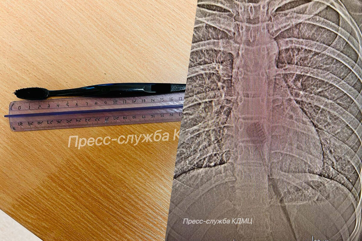 Девочка поступила в детскую больницу Казани с подозрением на проглоченное инородное тело. В ходе обследования медики обнаружили проглоченную зубную щетку, которая частично находилась в пищеводе, а частично — в желудке, создавая риск повреждения внутренних органов.