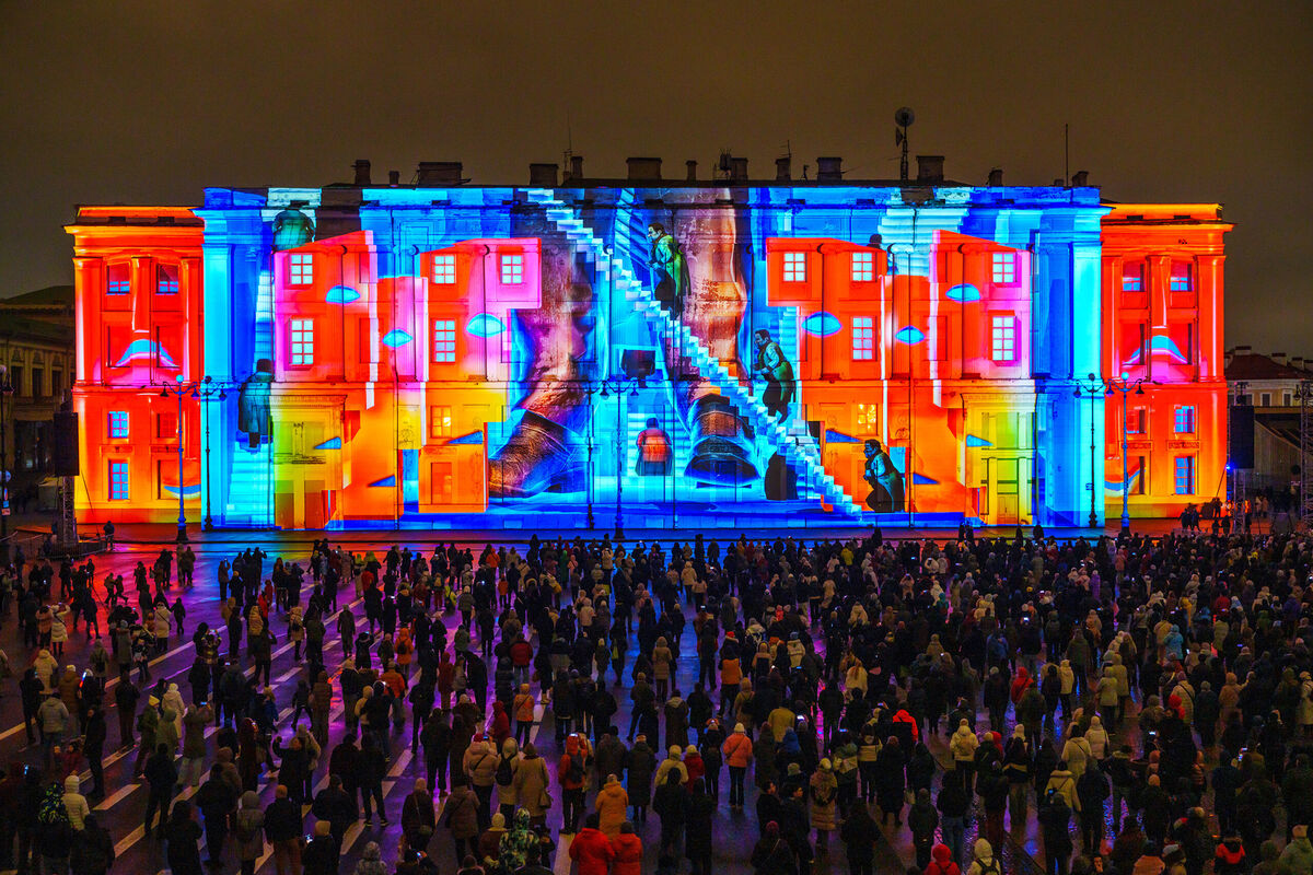 Фасад Штаба Гвардейского корпуса стал гигантским световым полотном. Мероприятие, поддерживаемое Президентским фондом культурных инициатив, собрало более 480 тыс. зрителей — это рекорд за четыре года существования проекта.
