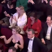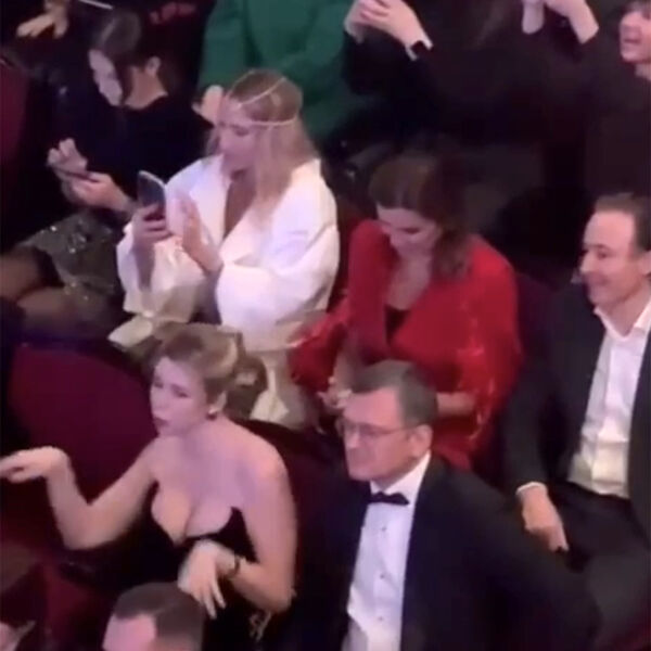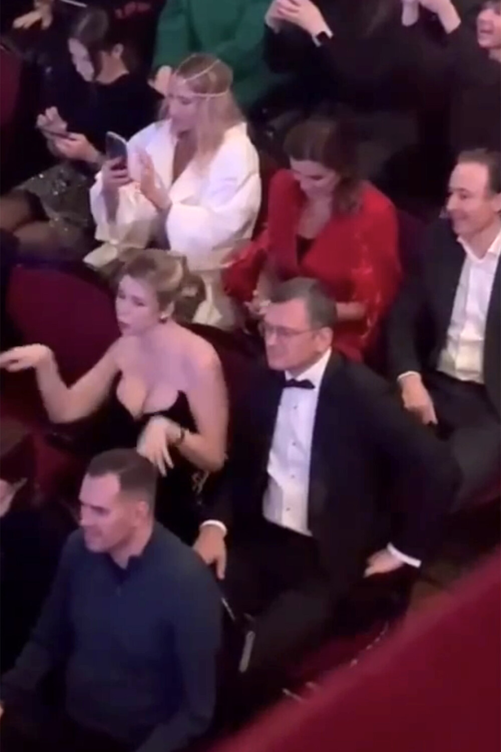 На кадрах видно, что Кулеба и Павелецкая сидят на креслах концертного зала возле прохода. Экс-министр одет в черный костюм, белую рубашку и галстук-бабочку, а его гражданская супруга — черное вечернее платье с глубоким декольте.