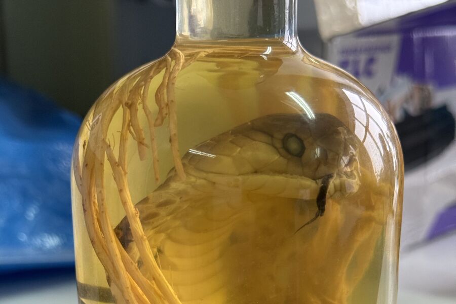 Стеклянную бутылку с надписью «Змеиное вино» нашли при досмотре у туристки в аэропорту Барнаула. Внутри была заспиртованная змея и корень растения.