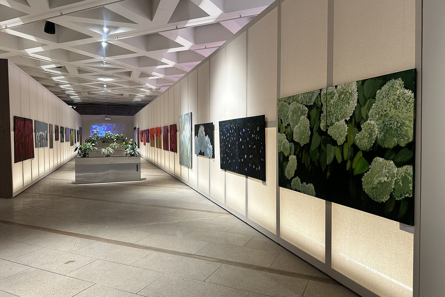 На выставке представлены картины маков, пионов, золотых шаров, гортензии, одуванчиков и других цветов.