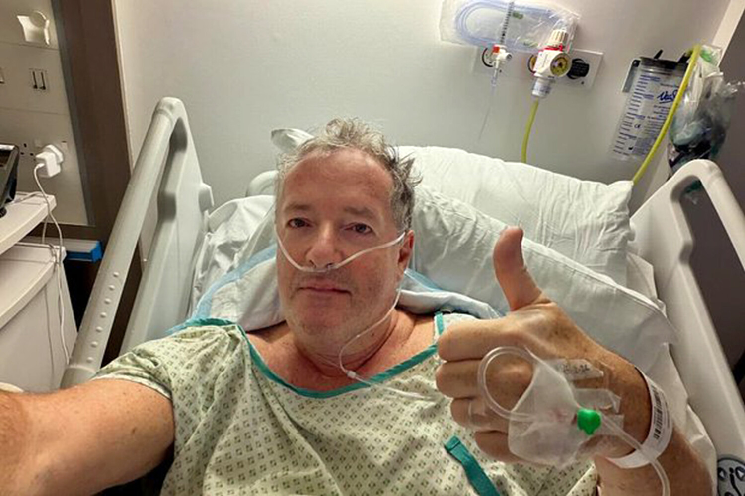 На фото 60-летний Морган лежит на койке в больничной одежде и показывает жест с большим пальцем вверх, демонстрирующий, что у него все хорошо. Журналист уточнил, что травмировался, когда споткнулся о небольшую ступеньку в одном из ресторанов Лондона и упал.