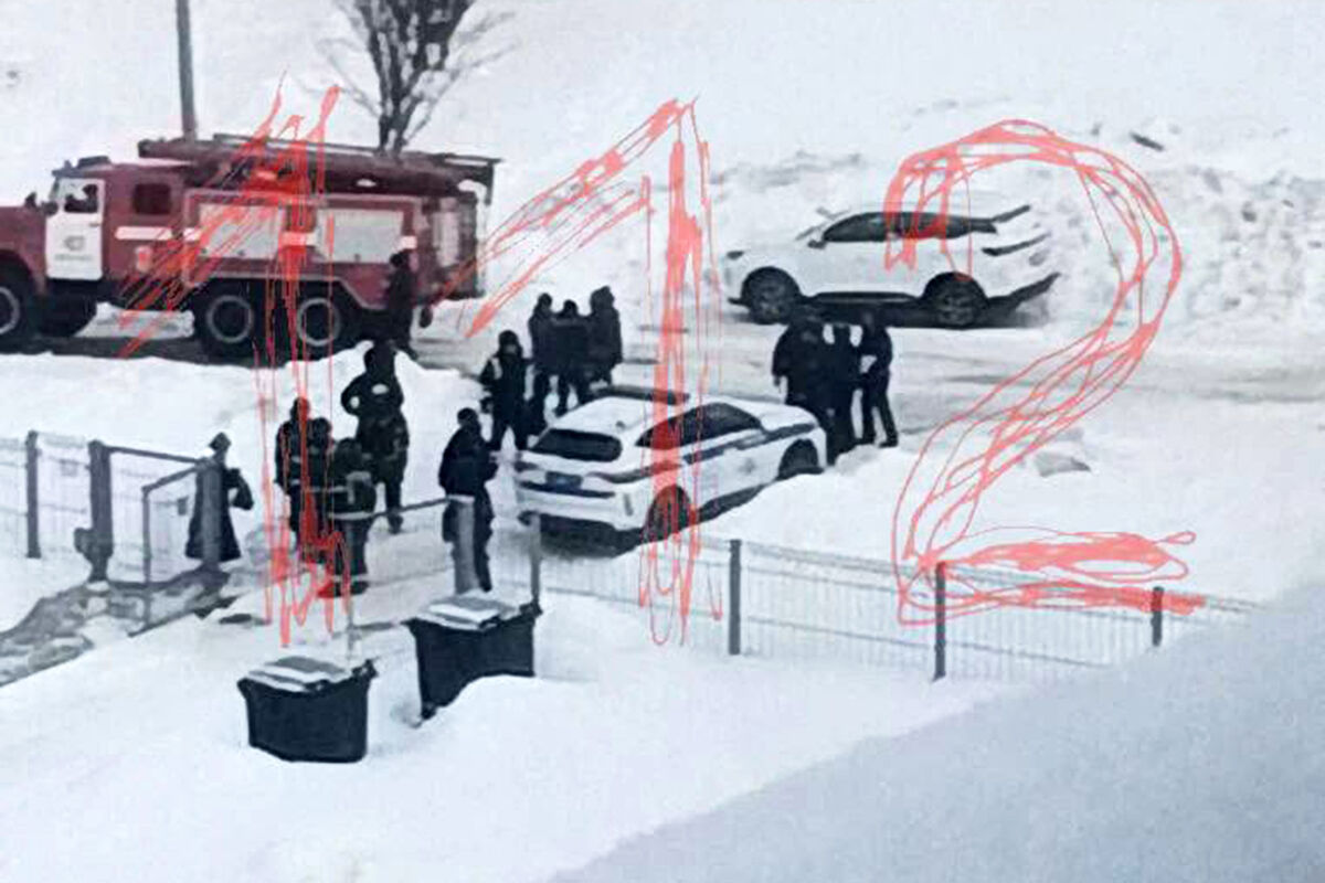 На кадрах с места инцидента заметна дорожка из капель крови, а также машина пожарных, полиция и, предположительно, силовики.