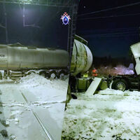 На опубликованных кадрах видно автоцистерну, которая перегородила железнодорожные пути, а также кабину грузовика, которая получила серьезные механические повреждения.