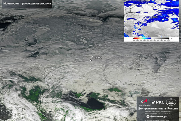 В корпорации «Роскосмос» сделали снимок снежного циклона над Москвой. Кадр опубликован в официальном Telegram-канале компании.
