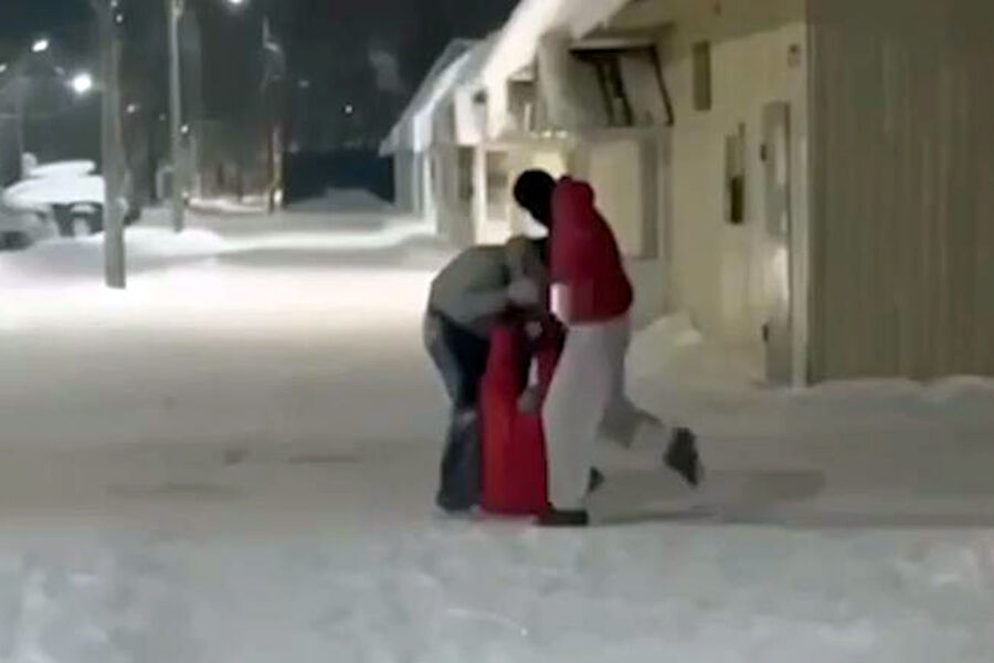 Инцидент произошел поздним вечером в Тихвине. На кадрах видно, как четверо подростков в балаклавах по очереди бьют руками и запинывают ногами жертву в красной куртке.